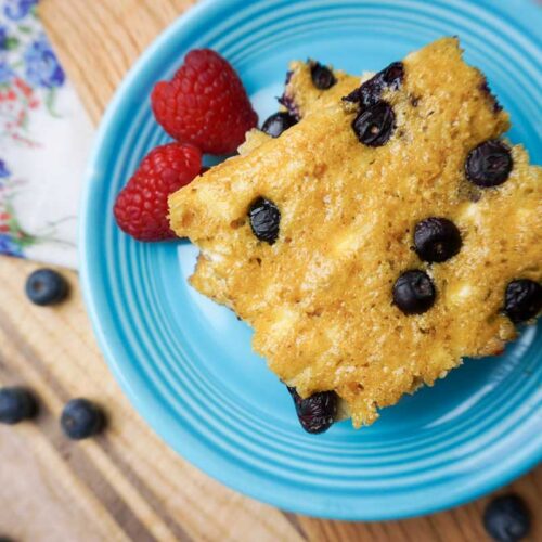 Blueberry cottage cheese breakfast bake is a healthy, high-protein breakfast made with cottage cheese, eggs, and whole wheat flour. Lightly sweet from real maple syrup, packed with protein, and perfectly filling. Easy to make ahead, and perfect for meal prep, this baked breakfast is great for busy mornings and will become a family favorite.