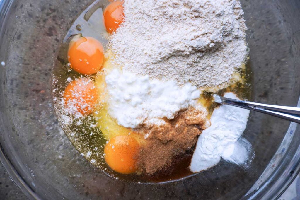 Step 2: In a large mixing bowl, combine all of the ingredients except for the blueberries. Mix together until combined.