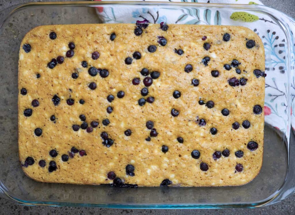- Pour the batter into the prepared pan. Sprinkle the blueberries evenly across the top.