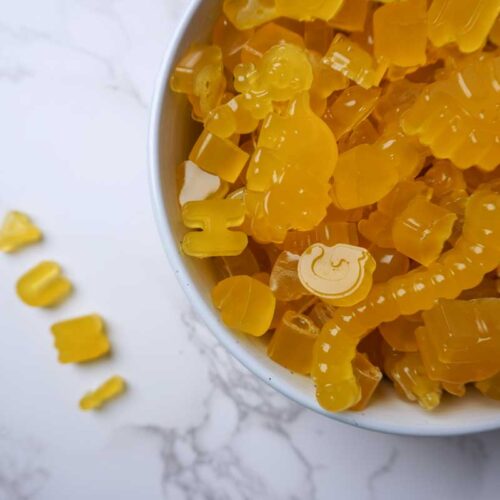 Adding a little bit of lemon juice (1/8 – 1/4 Cup) can also add a nice tart flavor to the gummies if the fruit juice is not strong enough. I’ve made these before with orange juice + lemon juice and the finished product is good (not as good as the mango though).